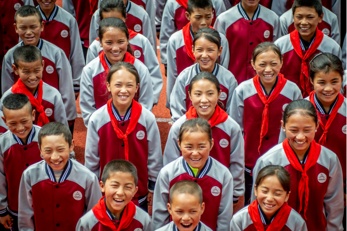 涼山州布拖縣阿布澤魯小學全體學生在開學典禮上穿上了愛心校服