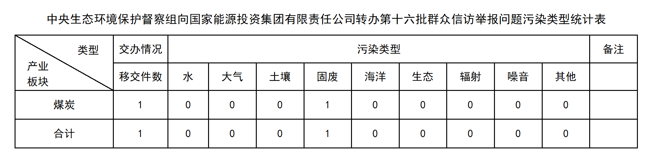 截至當(dāng)日,國家能源投資集團(tuán)有限責(zé)任公司已累計(jì)收到中央第五生態(tài)環(huán)境保護(hù)督察組交辦的信訪舉報(bào)件24件。涉及生態(tài)環(huán)境問題33件(一件舉報(bào)可能涉及多種問題類型),其中水6件、大氣5件、土壤2件、固廢10件、生態(tài)7件、噪音3件。所有舉報(bào)件均已及時(shí)轉(zhuǎn)交相關(guān)企業(yè)處理。