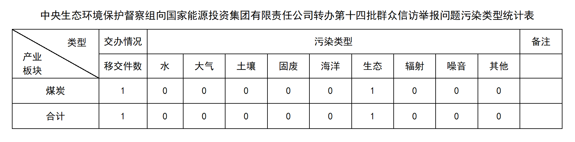 截至當(dāng)日,國家能源投資集團(tuán)有限責(zé)任公司已累計收到中央第五生態(tài)環(huán)境保護(hù)督察組交辦的信訪舉報件22件。涉及生態(tài)環(huán)境問題31件(一件舉報可能涉及多種問題類型),其中水6件、大氣5件、土壤2件、固廢9件、生態(tài)7件、噪音2件。所有舉報件均已及時轉(zhuǎn)交相關(guān)企業(yè)處理。