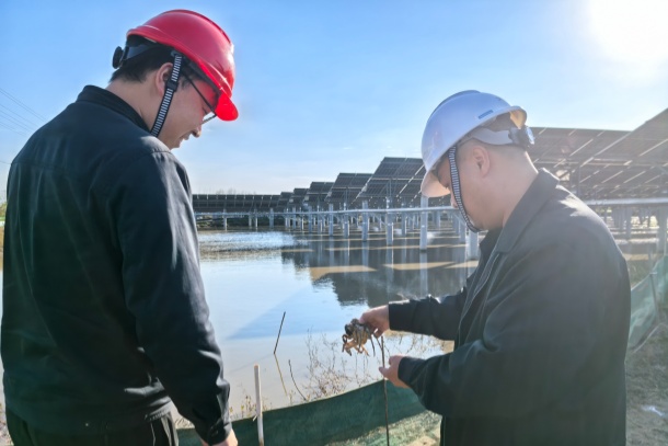 11月27日,龍?jiān)措娏Π不展境萏扉L(zhǎng)“漁光互補(bǔ)”項(xiàng)目汊澗匯流站,運(yùn)維人員正開展日常巡檢,養(yǎng)殖戶趙大海熱情地迎上前來(lái):“劉工,快來(lái)瞧瞧這批蟹!殼色青亮、肚皮雪白,一對(duì)大鉗子粗壯有力,再過(guò)半個(gè)月上市,準(zhǔn)能賣個(gè)好價(jià)錢!”他指向光伏板下泛著碎銀般波光的水面,語(yǔ)氣中難掩激動(dòng),“誰(shuí)能想到,光伏板底下也能養(yǎng)出‘致富蟹’,這日子真是越過(guò)越有盼頭!”