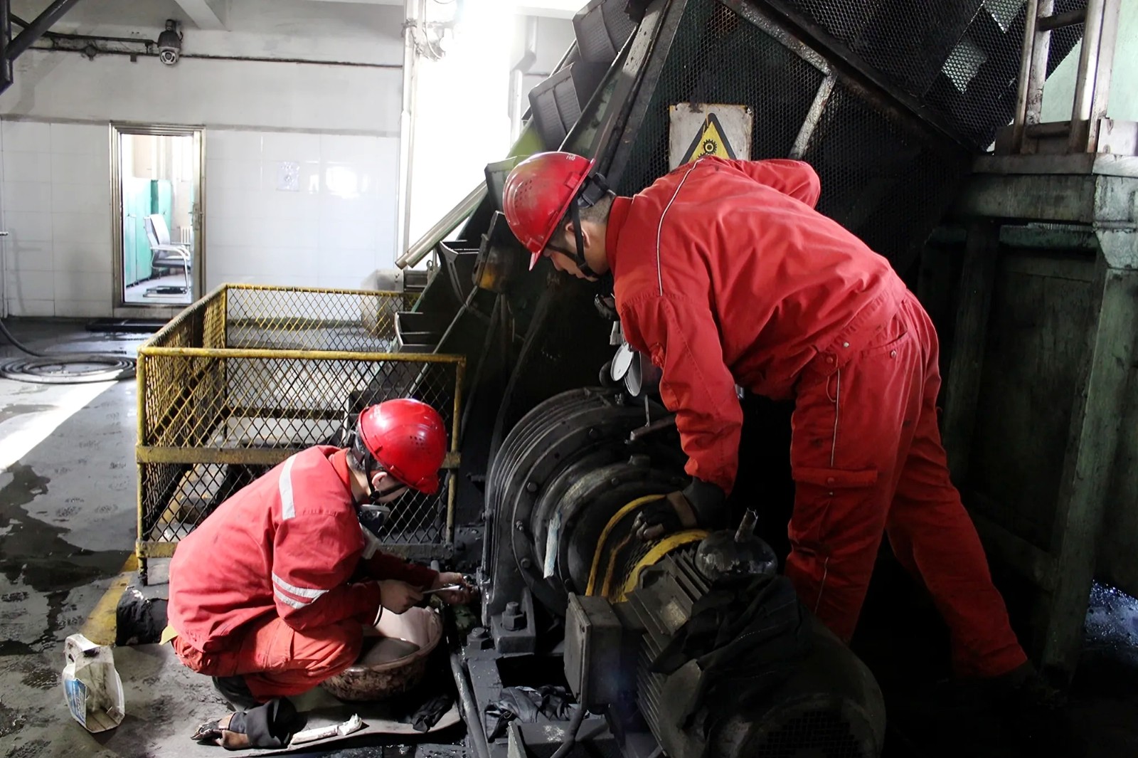 在王升指揮下,電工、操作工、起重工各就各位,鉗工竇明明和工友們的身影在逼仄的空間里靈活移動。驗電、閉鎖、拆卸電機線、吊開上溜槽……當破碎機核心部位暴露出來時,真正的挑戰(zhàn)才剛剛開始。積存的煤泥需要清理,沉重的舊齒板要靠導(dǎo)鏈一寸寸挪出。王升緊盯每個環(huán)節(jié),目光掃過每一個可能的風險點。煤塵撲面,汗水浸衣,時間在扳手的敲擊與導(dǎo)鏈的牽拉中悄然流逝。