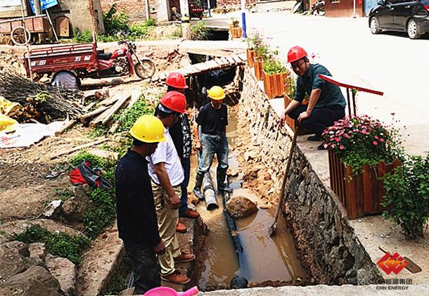圖為該公司駐村干部檢查臘坑村污水收集管網施工